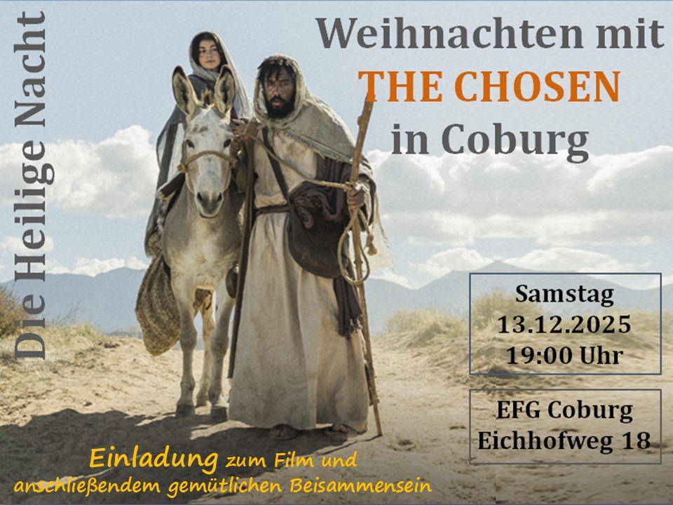 Wir laden Sie hiermit herzlich - am Samstag, 13.12.2025 - zu einem gemütlichen Filmabend in unsere Gemeinde ein. Aus der Serie "The Chosen", sehen wir die Folge: "Die Heilige Nacht". |